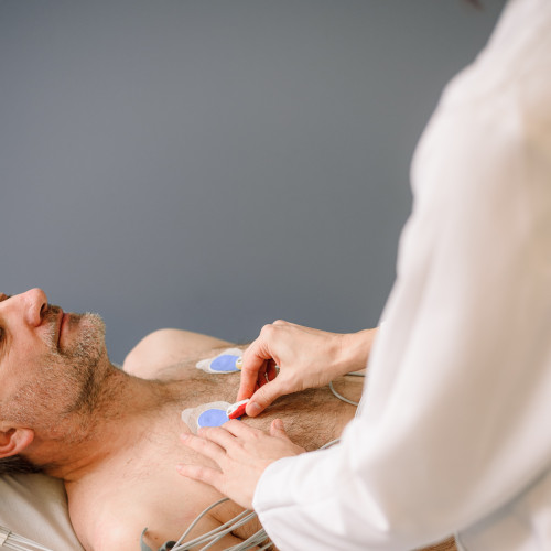 Bei einem Elektrokardiogramm (EKG) wird die elektrische Aktivität des Herzens abgeleitet und aufgezeichnet. So können der aktuelle Herzrhythmus und die Herzfrequenz bestimmt werden und Hinweise für Herzerkrankungen wie koronare Herzerkrankung (KHK) oder Herzrhythmusstörungen gefunden werden.